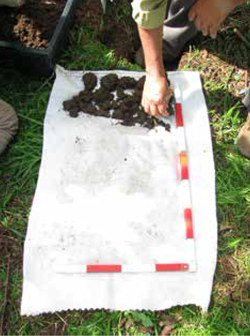 Buscamos las estructuras biológicas que expresa la Drilósfera, las que, podemos encontrar en la superficie del suelo y al interior de él. En superficie, podemos encontrar cúmulos de estiércol (turrículos) dejados por las lombrices de tierra, reconocibles por su color obscuro y forma globular altamente nutricios (Figura 23). Para observar las estructuras en profundidad, tomamos algunos terrones de suelo y también observamos las paredes que han quedado al extraer el cubo de suelo de los procedimientos utilizados para la percepción de la Agregatósfera.Buscamos galerías, túneles (horizontales o verticales), madrigueras, dejadas por las lombrices de tierra, como resultado de su desplazamiento y actividad a través del suelo (Figura 24).