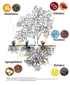 En esta publicación podemos encontrar los conceptos de Detritósfera y Rizósfera como las principales fuentes de materia orgánica, minerales y energía del suelo, a la Drilósfera como la generadora de las redes de bioporos y activadora de los microrganismos, especialmente los hongos y a la Agregatósfera y Porósfera como la expresión física de la organización de la vida de los suelos. Cada una de estas esferas se definen más adelante en el texto.