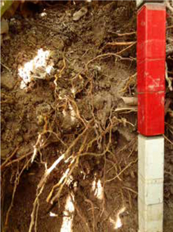 Cuando nos detenemos a observar esta esfera nos acercamos a lo que algunos reconocen como el sistema nervioso del suelo. Observamos la presencia de las raíces en el perfil. Estas raíces pueden estar en la superficie, tener una distribución horizontal homogénea, una distribución gradual vertical o una