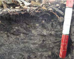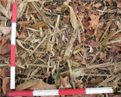 En el detritus podemos observar su cubrimiento, origen, el estado de descomposición y su espesor. Su origen puede estar dado por hojas, acículas, restos de plantas herbáceas, conos o frutos, rastrojos del cultivo o restos de podas menores (sarmientos) o mayores (troncos) (Figura 12). Los materiales que lo componen pueden estar desde muy sueltos, a fuertemente cohesionados por las hifas de los hongos.