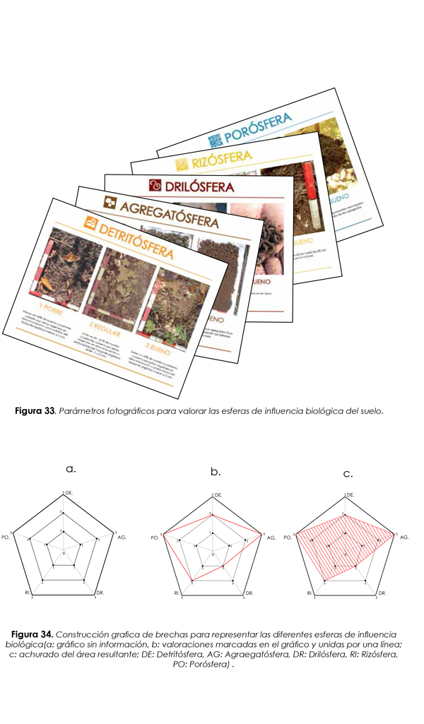 Colocaremos las esferas siguiendo con el orden en que se presentan en los procedimiento del presente manual, comenzando desde el vértice superior con la Detritósfera,seguida por la Agregatósfera, Drilósfera, Rizósfera y terminando con la Porósfera. En el caso de ser necesario graficar con algún software o el determinar promedios, se puede asociar a la pobre condición el valor de 1, regular un 2 y a la buena un 3.