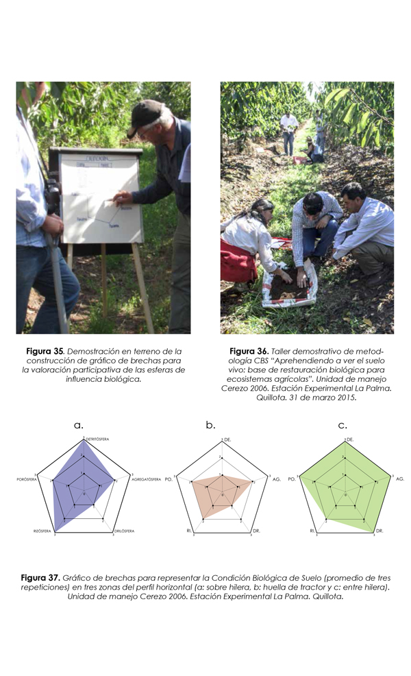 Como parte de las actividades de transferencia del programa de Restauración Biológica de Suelo del año 2015, se realizó una determinación participativa de la CBS, donde asisitieron 35 personas entre agricultores, productores agrícolas y estudiantes (Figura 36). Durante la actividad se pudo observar la expresión de la condición de tres zonas del perfil horizontal de una unidad de manejo de Cerezo, validándose mediante la participación y consenso de todos los participantes del taller (Figura 37).